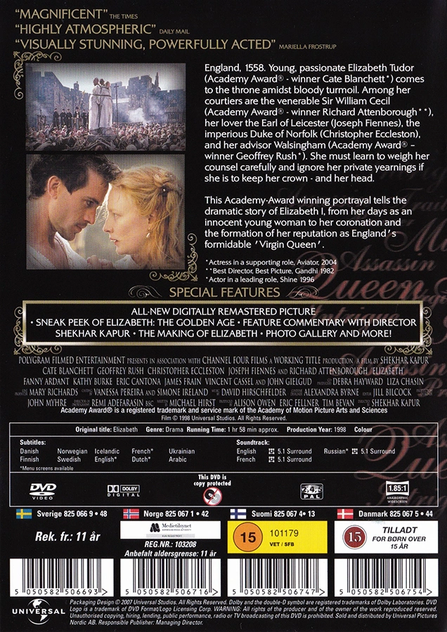 England, 1558. Young, passionate Elizabeth Tudor (Academy Award®-winner Cate Blanchett*) comes to the throne amidst bloody turmoil. Among her courtiers are the venerable Sir William Cecil (Academy Award®-winner Richard Attenborough* *), her lover the Earl of Leicester (Joseph Fiennes), the imperious Duke of Norfolk (Christopher Eccleston), and her advisor Walsingham (Academy Award® – winner Geoffrey Rush). She must learn to weigh her counsel carefully and ignore her private yearnings if she is to keep her crown – and her head.