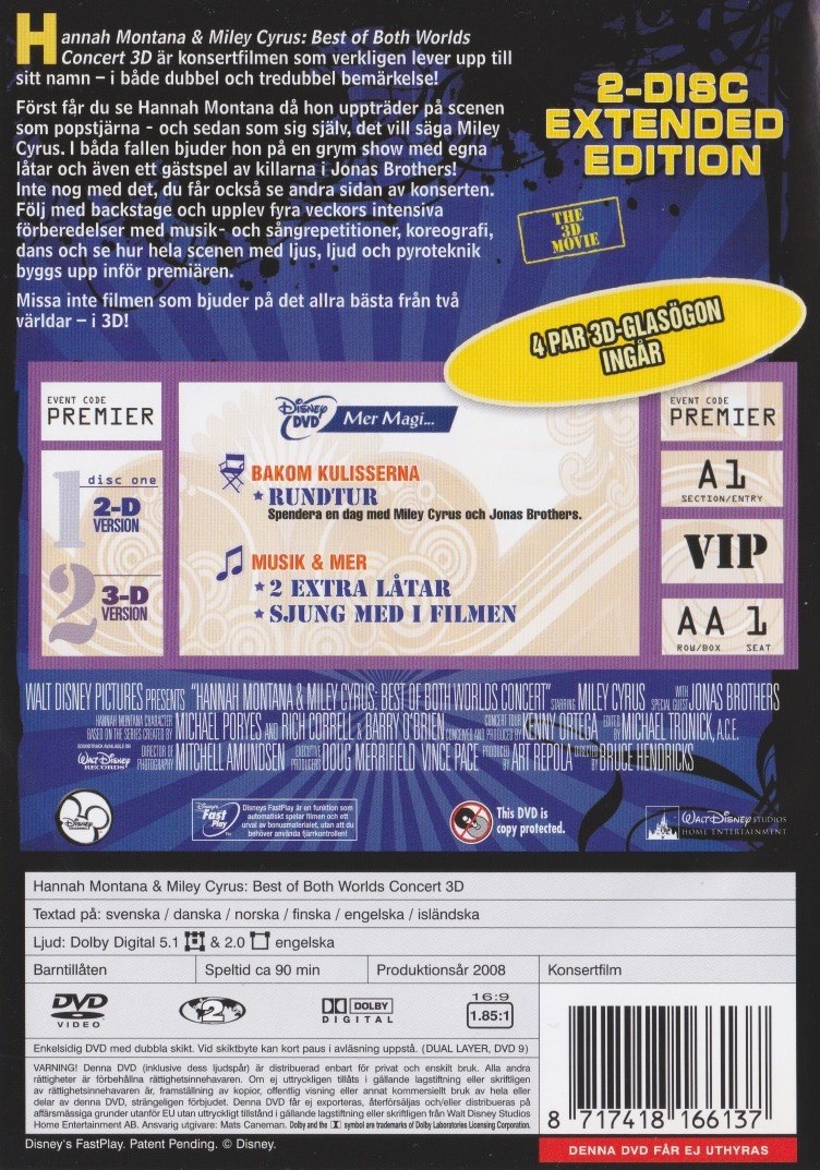 Först får du se Hannah Montana då hon uppträder på scenen som popstjärna – och sedan som sig själv, det vill säga Miley Cyrus. I båda fallen bjuder hon på en grym show med egna låtar och även ett gästspel av killarna i Jonas Brothers!