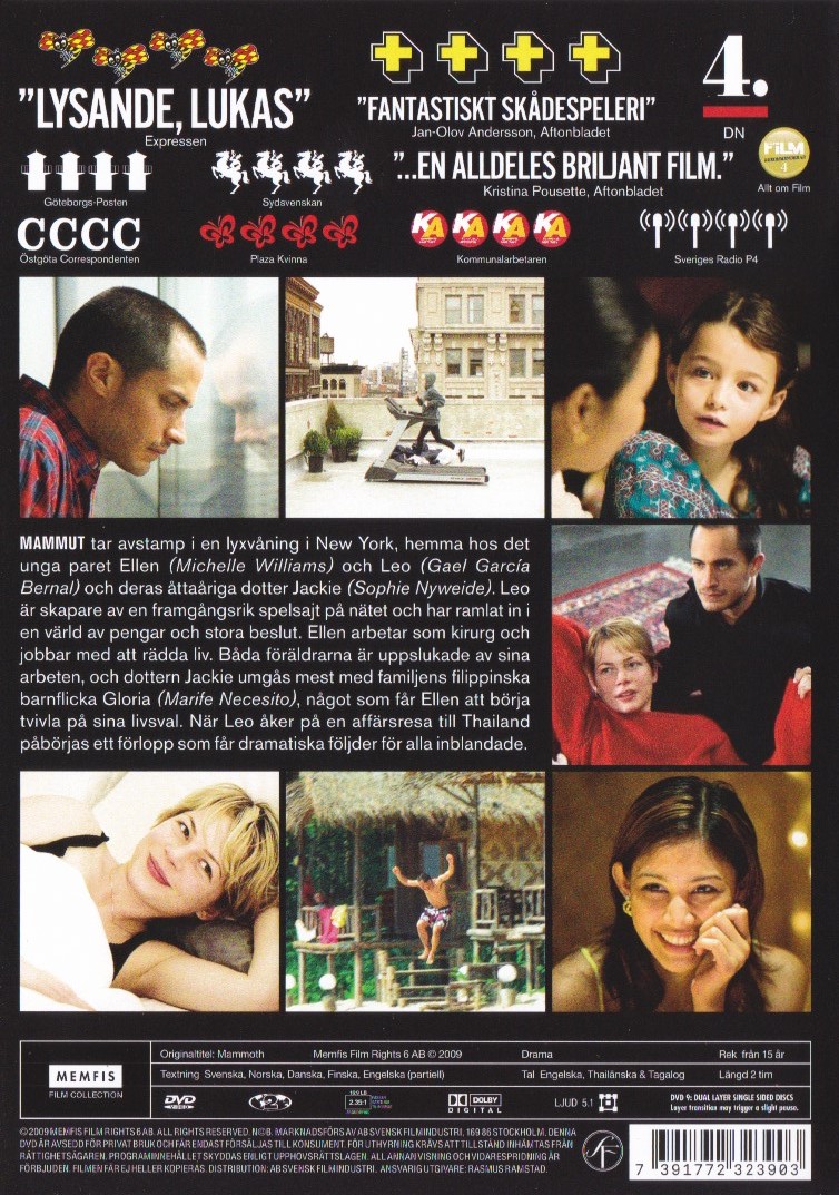 MAMMUT tar avstamp i en lyxvåning i New York, hemma hos det unga paret Ellen (Michelle Williams) och Leo (Gael García Bernal) och deras åttaåriga dotter Jackie (Sophie Nyweide). Leo är skapare av en framgångsrik spelsajt på nätet och har ramlat in i en värld av pengar och stora beslut. Ellen arbetar som kirurg och jobbar med att rädda liv. Båda föräldrarna är uppslukade av sina arbeten, och dottern Jackie umgås mest med familjens filippinska barnflicka Gloria (Marife Necesito), något som får Ellen att börja tvivla på sina livsval. När Leo åker på en affärsresa till Thailand påbörjas ett förlopp som får dramatiska följder för alla inblandade.