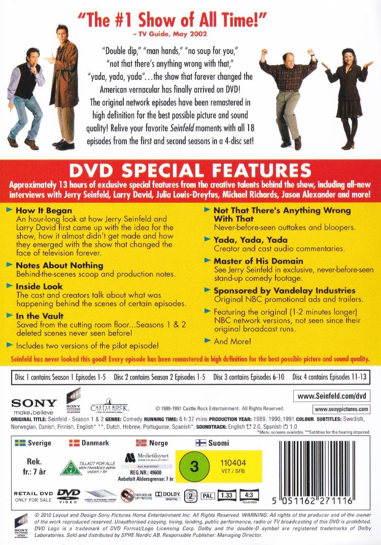 Boxen innehåller även ca 13 timmar med exklusivt extramaterial från skaparna av serien, till exempel helt nya intervjuer med Jerry Seinfeld, Larry David, Julia Louis-Dreyfus, Michael Richards och Jason Alexander och många fler!