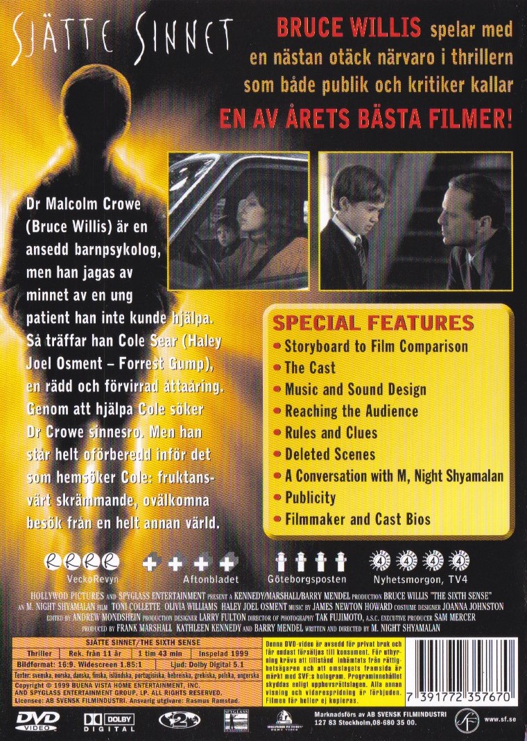 Psykologen Malcolm Crowe firar sin senaste utmärkelse tillsammans med hustrun Anna. In bryter sig en f d patient, Vincent Gray, som skjuter Malcolm och sedan sig själv. Några månader senare tar sig Malcolm an en störd nioårig pojke, Cole Sear, som lever tillsammans med sin mamma. Cole talar om att han besöks av döda personer som ber om hans hjälp. Malcolm tror inte att han kan hjälpa Cole, men Cole ber honom fortsätta. En av de döda som Cole ser, Kyra, leder honom till ett videoband som bevisar – inför begravningsgästerna – att hon blivit mördad.
