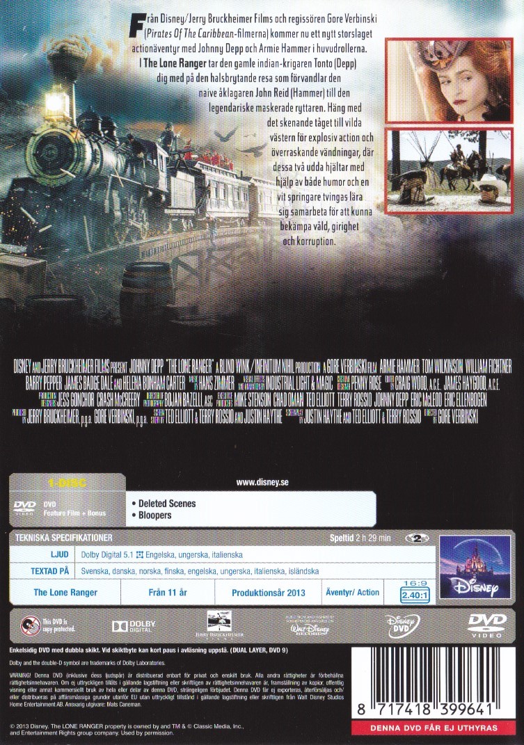 The Lone Ranger tar den gamle indian-krigaren Tonto (Depp) dig med på den halsbrytande resa som förvandlar den naive åklagaren John Reid (Hammer) till den legendariske maskerade ryttaren. Häng med det skenande tåget till vilda västern för explosiv action och överraskande vändningar, där dessa två udda hjältar med hjälp av både humor och en vit springare tvingas lära sig samarbeta för att kunna bekämpa vild, girighet och korruption.