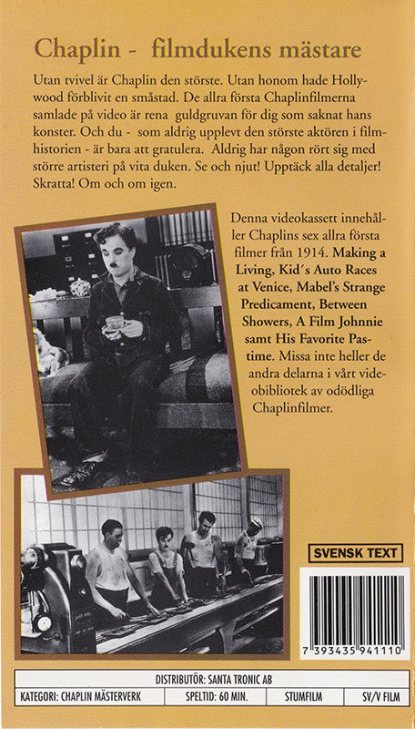 Denna videokassett innehåller Chaplins sex allra första filmer från 1914.