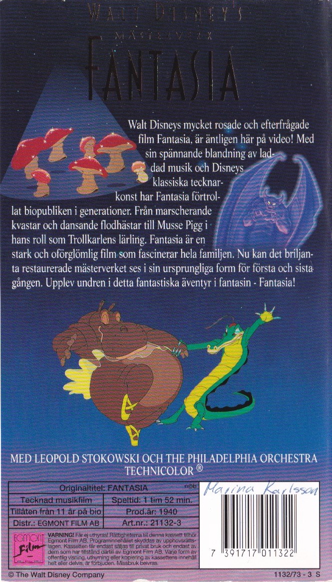 Walt Disneys mycket rosade och efterfrågade film Fantasia, är äntligen här på video! Med sin spännande blandning av laddad musik och Disneys klassiska tecknarkonst har Fantasia förtrollat biopubliken i generationer. Från marscherande kvastar och dansande flodhästar till Musse Pigg i hans roll som Trollkarlens lärling.